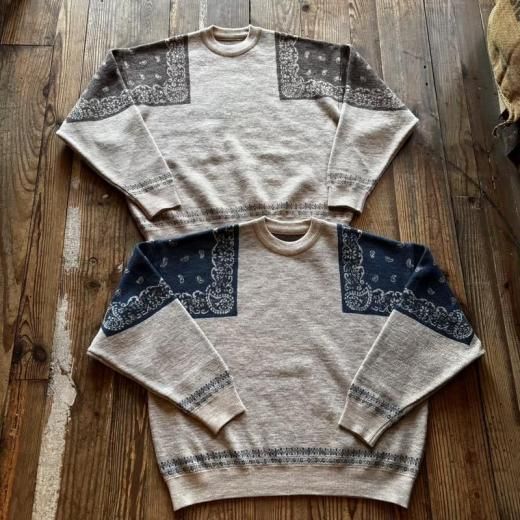 柔らかい着心地のバンダナ柄ニットクルーセーター。
